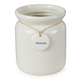 Created from stoneware, this utensil jar features a hang tag and is finished in cream and is dishwasher safe.