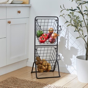 * Made from 100% Iron * Rust proof & moisture proof * Perfect for storing, fruits & vegetables, onions & potatoes * Sturdy & easy to assemble * Angled baskets make them easily accessible Keep your fruits and vegetables fresh and accessible with the Black Wire 2 Tier Free Standing Baskets. Made from 100% iron,…