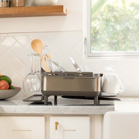 * Modern & durable * Solid stainless steel frame * Includes swivel spout * Keep dishes secure * Includes 5 year guarantee Keep your dishes and kitchenware’s organised with the Simple Human dish rack. Its solid stainless steel frame complements modern kitchens, while the swivel spout ensures effortless drainage.